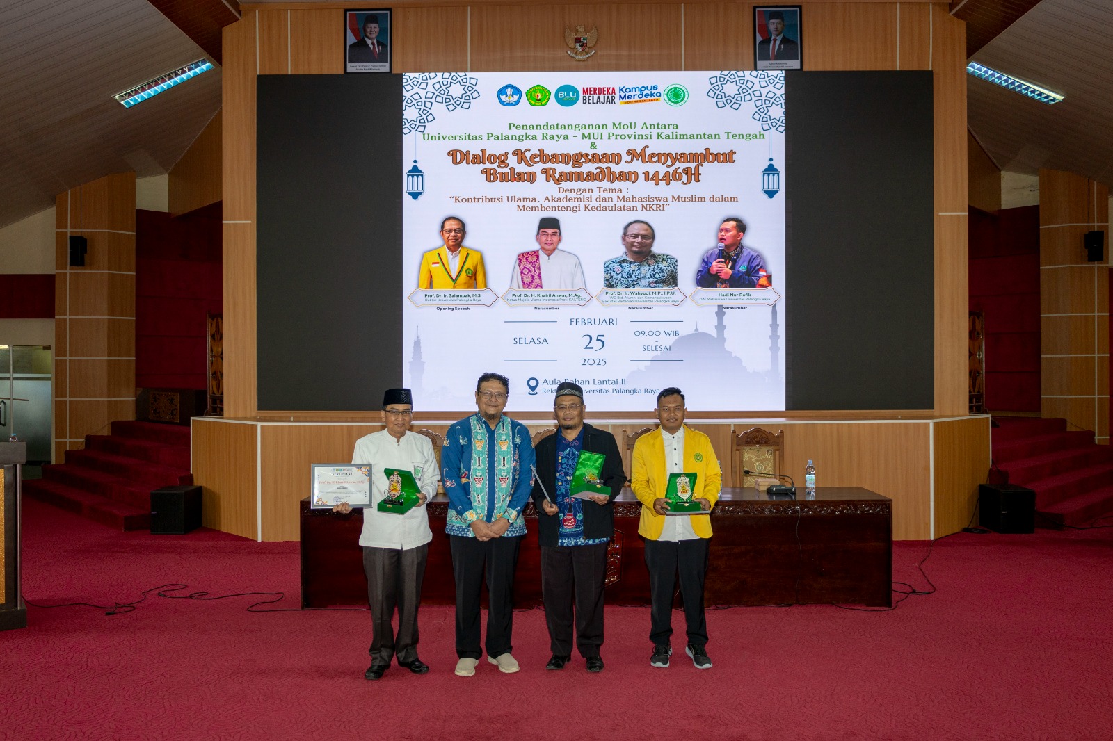 Sejalan dengan agenda tersebut, UPR dan MUI Kalteng turut menggelar Dialog Kebangsaan dengan tema Kontribusi Ulama, Akademisi, dan Mahasiswa Muslim dalam Membentengi Kedaulatan NKRI. Ketua Umum MUI Kalteng, Prof. Dr. KH. Khairil Anwar, M.Ag., membawakan materi Membangun Toleransi dan Keharmonisan dalam Konteks Moderasi Beragama, sementara Prof. Dr. Ir. Wahyudi, M.P., IPU., CIIQA, membahas Cinta Tanah Air.