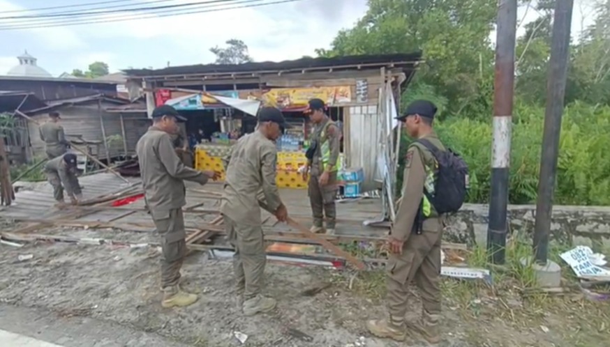 Penindakan dilakukan secara bertahap terhadap bangunan yang digunakan sebagai tempat berjualan namun berdiri di atas fasilitas umum yang seharusnya steril dari pemanfaatan pribadi.