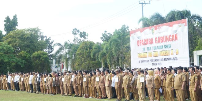 PALANGKARAYA – Pemerintah Kota Palangka Raya menggelar upacara gabungan dalam rangka memperingati Hari Lahir Pancasila yang berlangsung di halaman Kantor Wali Kota Palangka Raya, Senin (2/6/2025).
