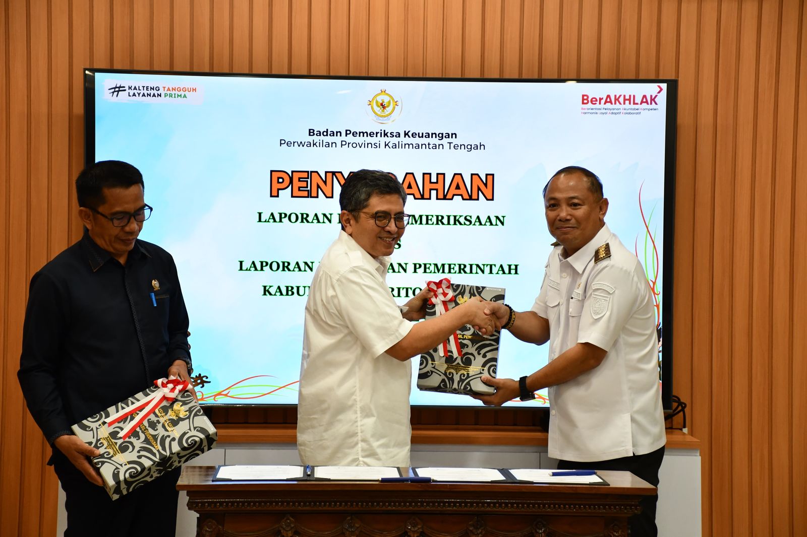 Penyerahan Laporan Hasil Pemeriksaan (LHP) dilakukan di Gedung BPK RI Perwakilan Kalimantan Tengah oleh Kepala BPK Dodik Achmad Akbar kepada Bupati Barsel Eddy Raya Samsuri.