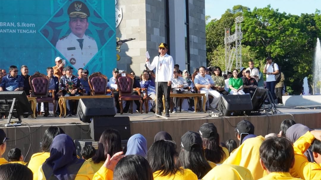 Gubernur Kalteng, Agustiar Sabran saat memberikan pembekalan kepada ribuan mahasiswa UPR yang akan mengikuti KKN Periode I Tahun 2025.