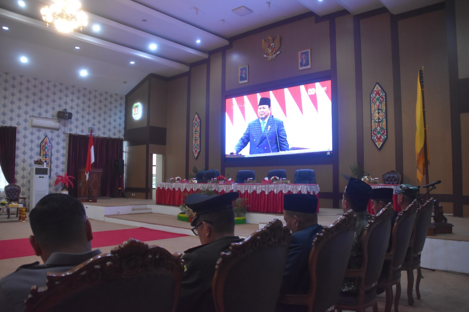 KASONGAN – Bupati Katingan Saiful bersama Wakil Bupati Firdaus menghadiri Rapat Paripurna DPRD Kabupaten Katingan untuk menyimak pidato kenegaraan Presiden Republik Indonesia secara daring, Jumat (15/8/2025).