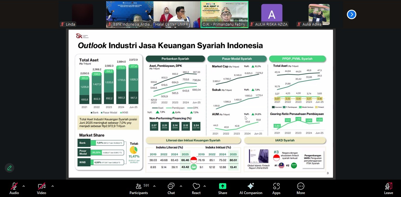PALANGKARAYA – Otoritas Jasa Keuangan (OJK) Kalimantan Tengah bersama Universitas Muhammadiyah Palangka Raya, Bank Indonesia, serta Dinas Perindustrian dan Perdagangan Kalimantan Tengah menggelar kegiatan literasi keuangan syariah yang difokuskan pada penguatan ekosistem halal. Kegiatan ini dilaksanakan secara hybrid, Selasa, 30 September 2025.