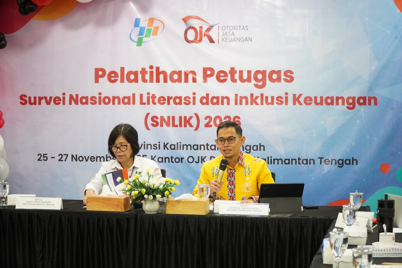 FOTO Ist.: Kepala BPS Provinsi Kalimantan Tengah, Agnes Widiastuti (kiri, mengenakan baju kemeja putih), bersama Kepala OJK Provinsi Kalimantan Tengah, Primandanu Febriyan Aziz (kanan, mengenakan baju batik kuning), pada kegiatan pelatihan SNLIK 2026.