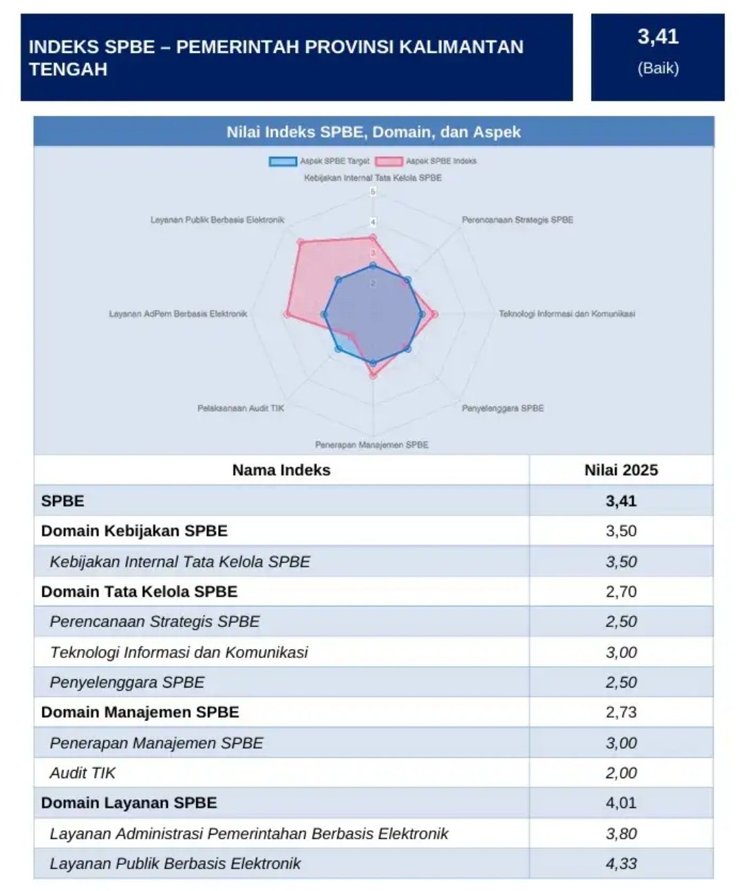 Berdasarkan rilis resmi Tim Koordinasi SPBE Nasional pada Rabu (7/1/2026) melalui Aplikasi Tauval di laman tauval.spbe.go.id, Indeks SPBE Kalteng mencapai nilai 3,41 dengan kategori Baik.