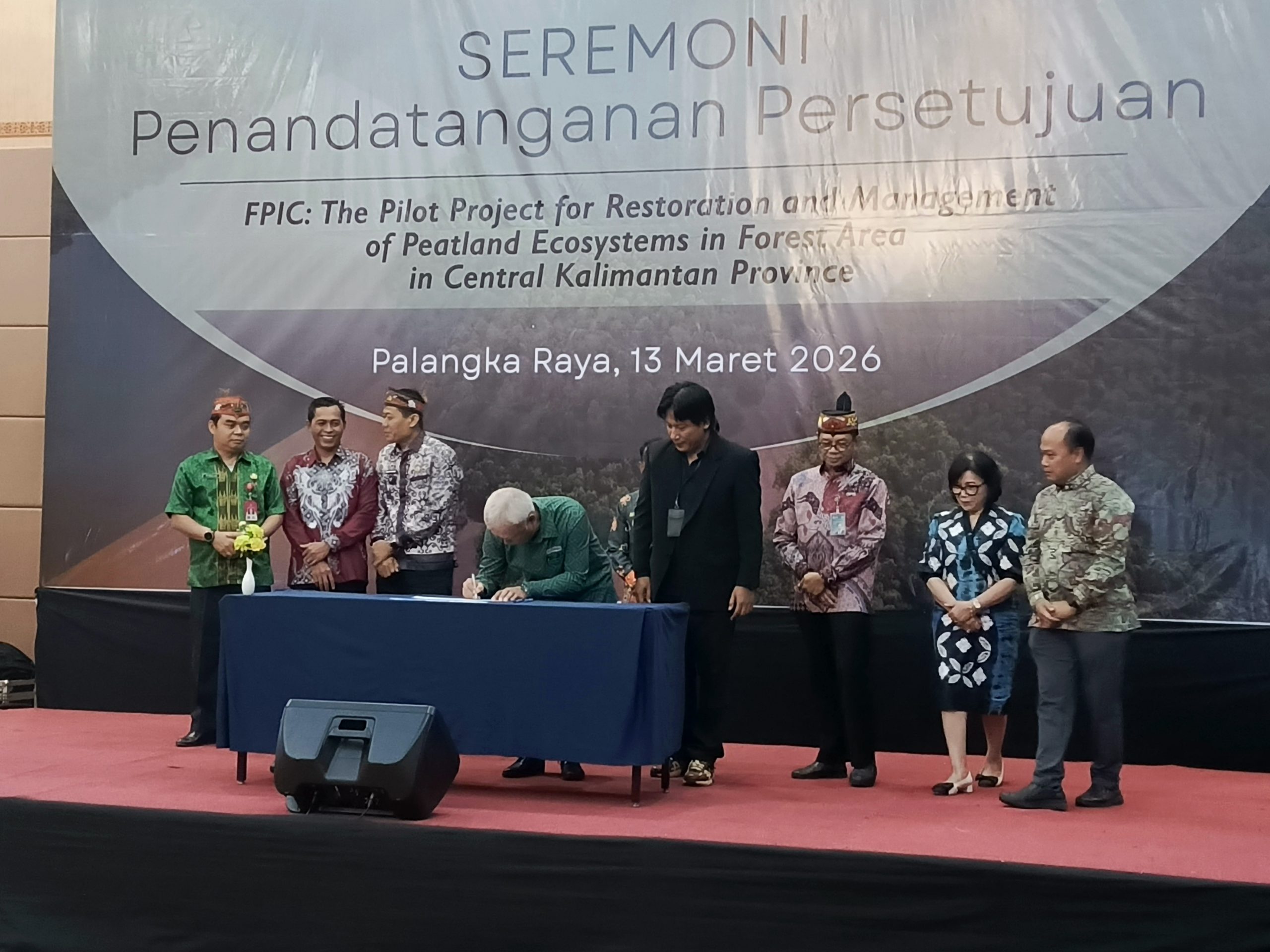 Penandatanganan FPIC untuk The Pilot Project for Restoration and Management of Peatland Ecosystem in Forest Area in Central Kalimantan Province dilaksanakan pada Jumat pagi di Seruyan Ballroom, Hotel Bahalap, Jalan RTA Milono, Kota Palangka Raya.